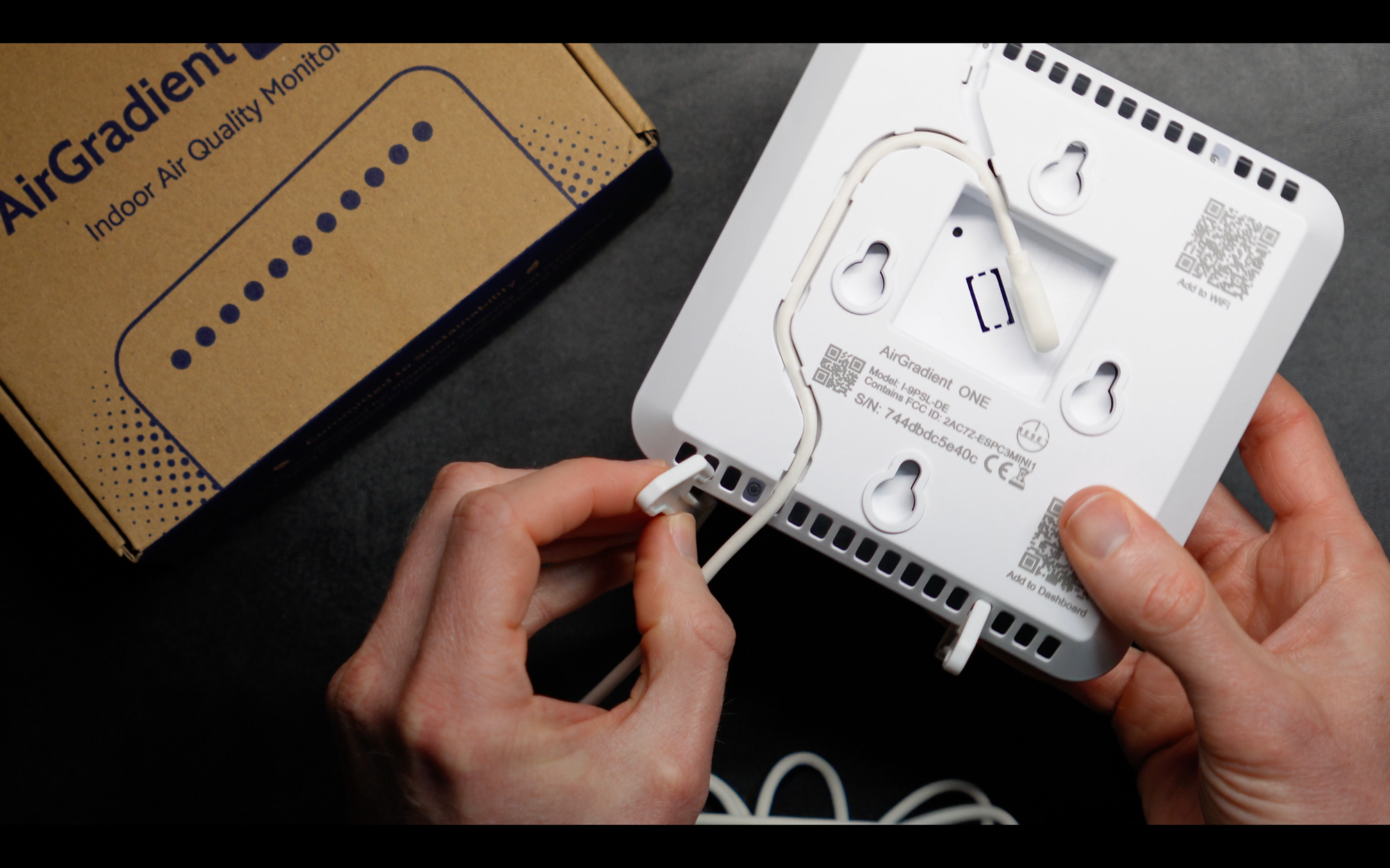 To set up the AirGradient, plug it into power using the provided USB-C to USB-A cable. Then, scan the “Add to WiFi” QR code printed on the back of the device, and join the network that appears.