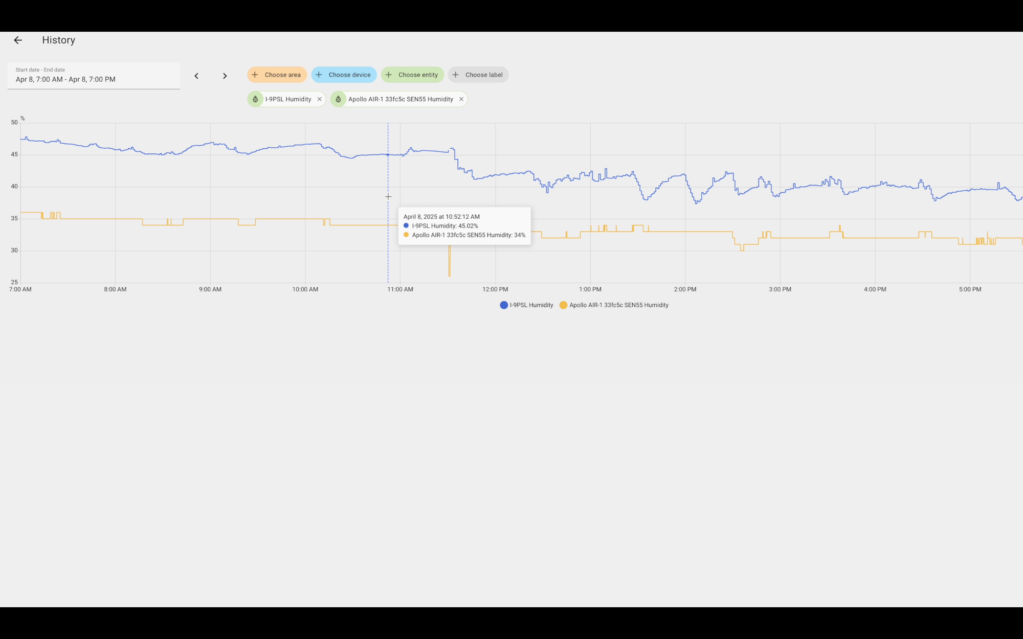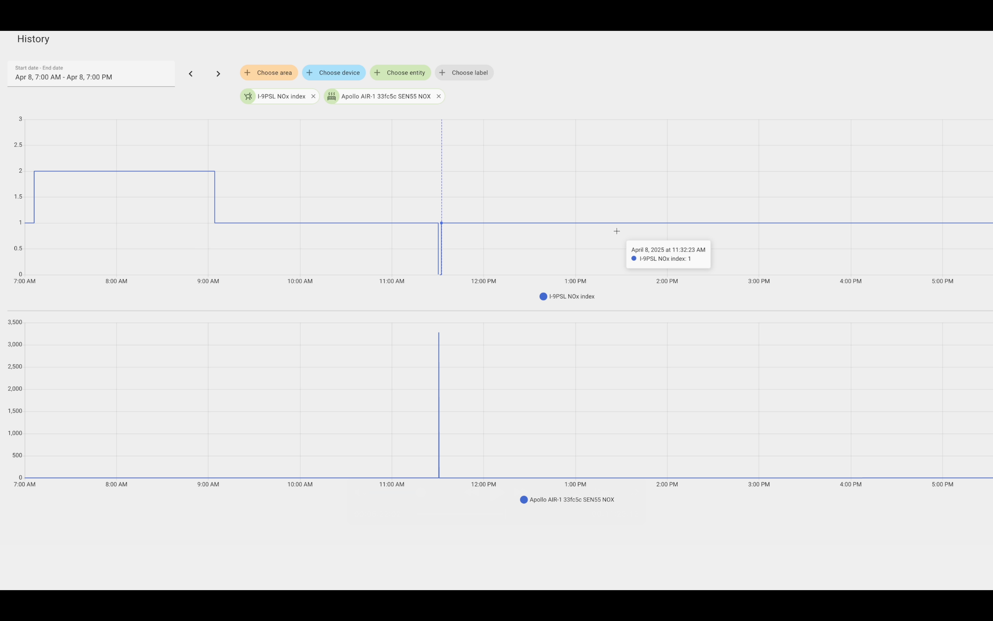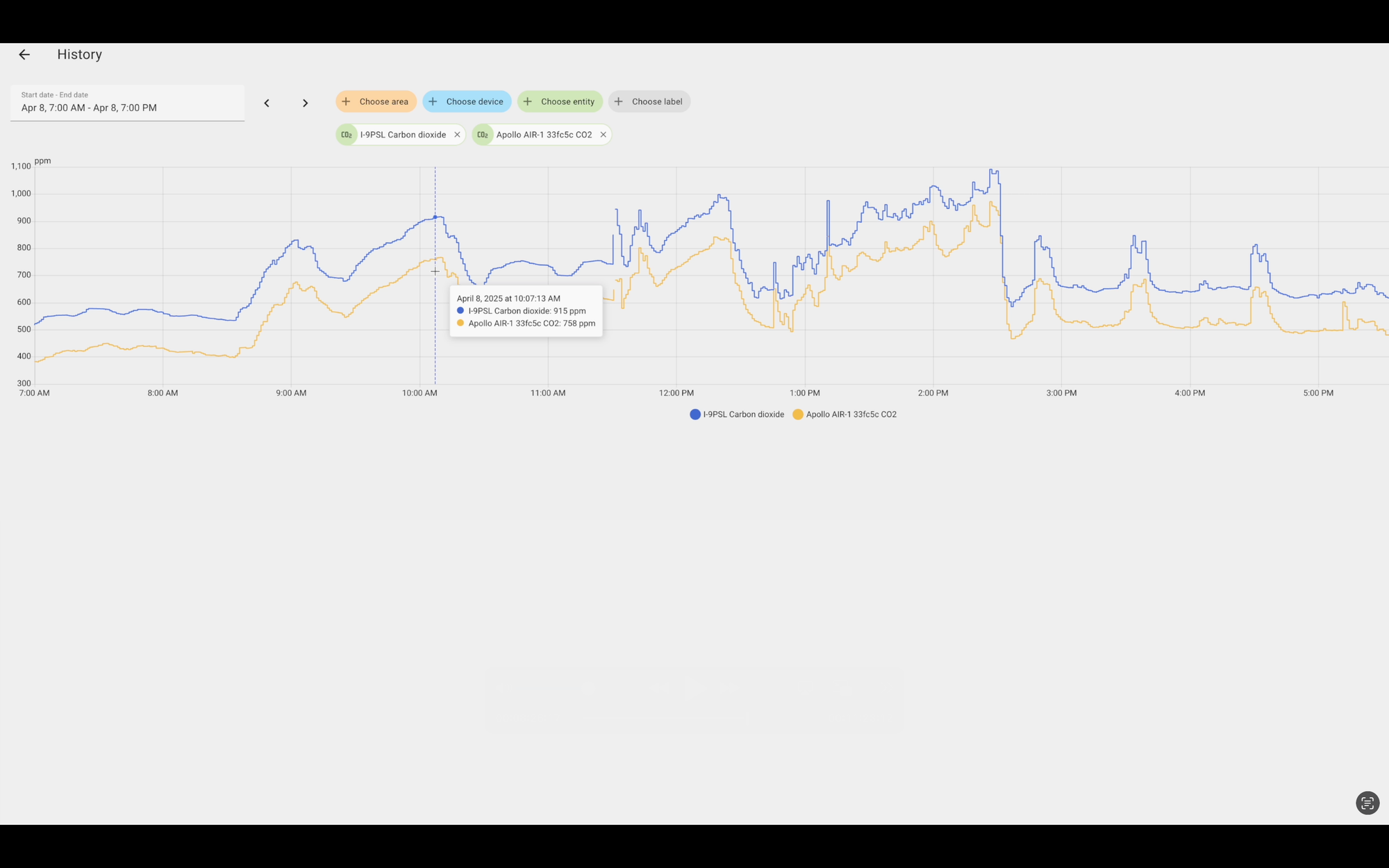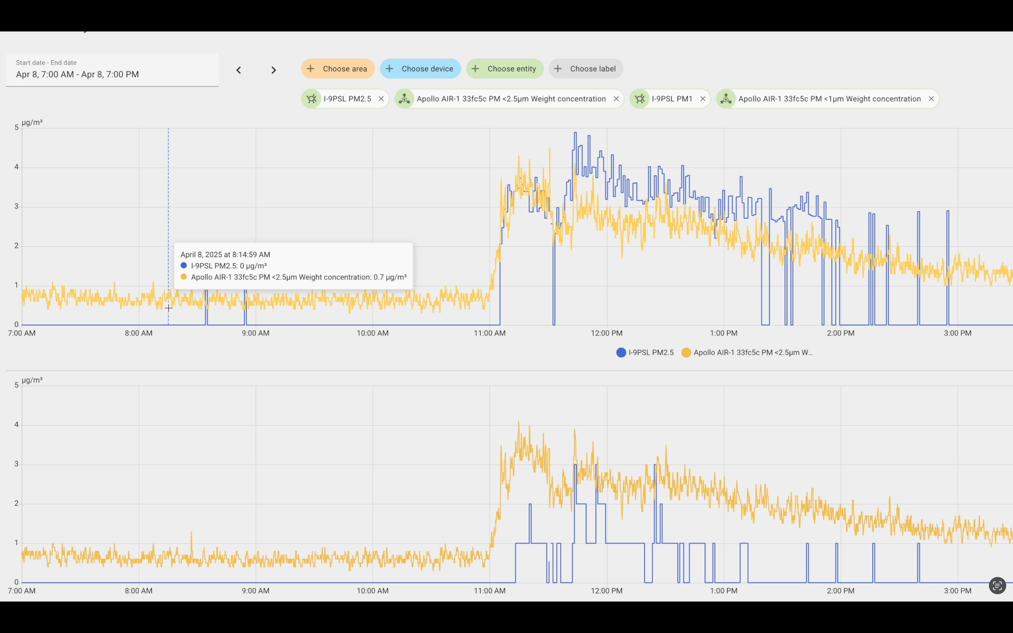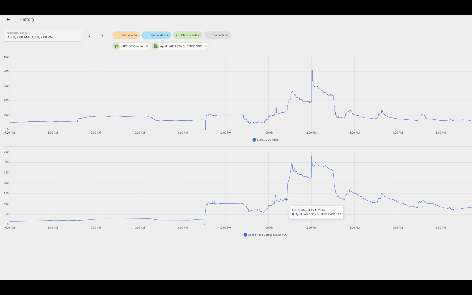 Both sensors generally moved in the same direction, but the AirGradient data was much spikier, and did not report the same level of granularity in changes as the Apollo. Both entities were set to the same default precision in Home Assistant.