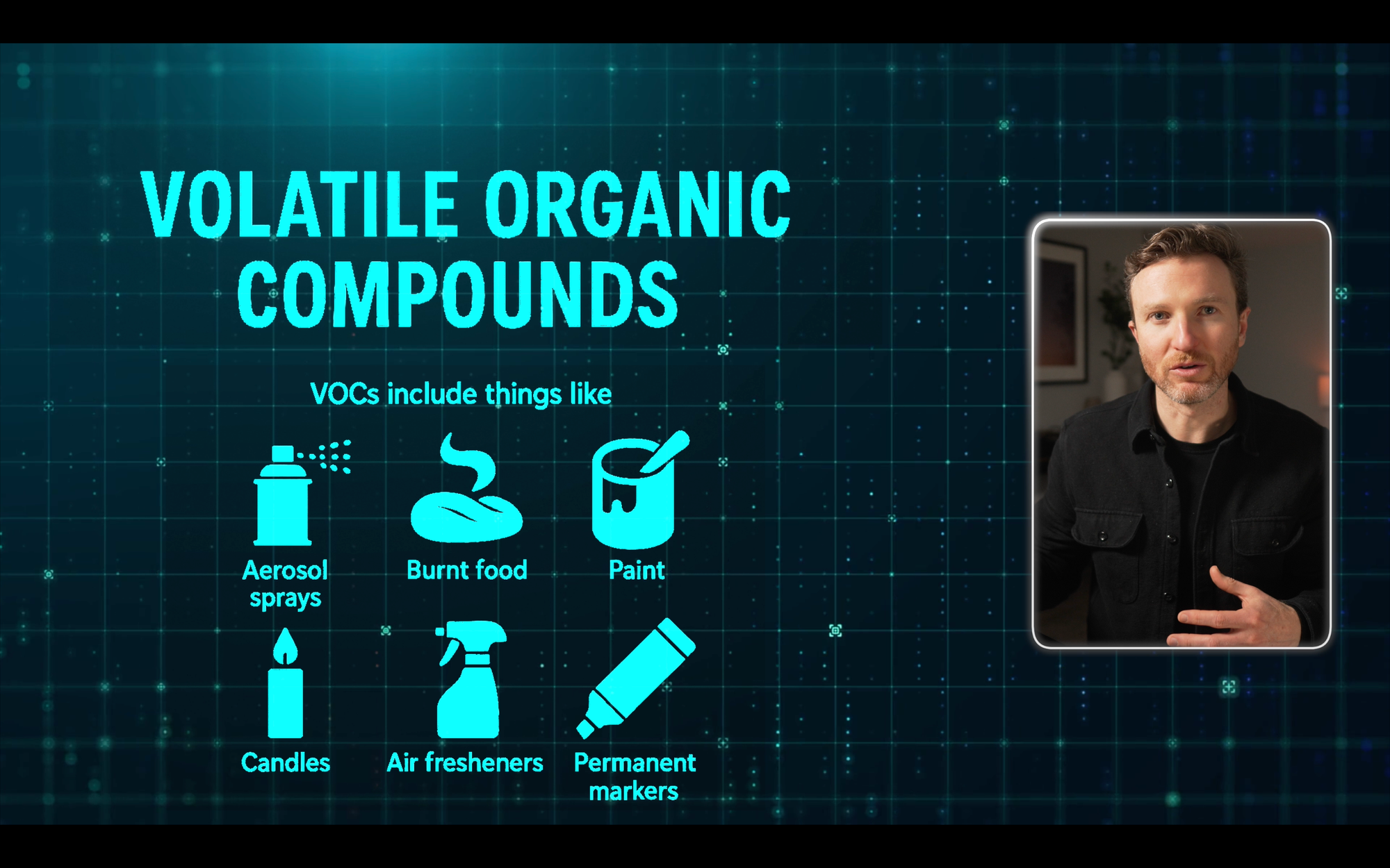 Volatile Organic Compounds (VOCs) are also in the air and can be harmful…or harmless. VOCs include things like aerosol sprays, burnt food, paint, candles, air fresheners, permanent markers, and much more.