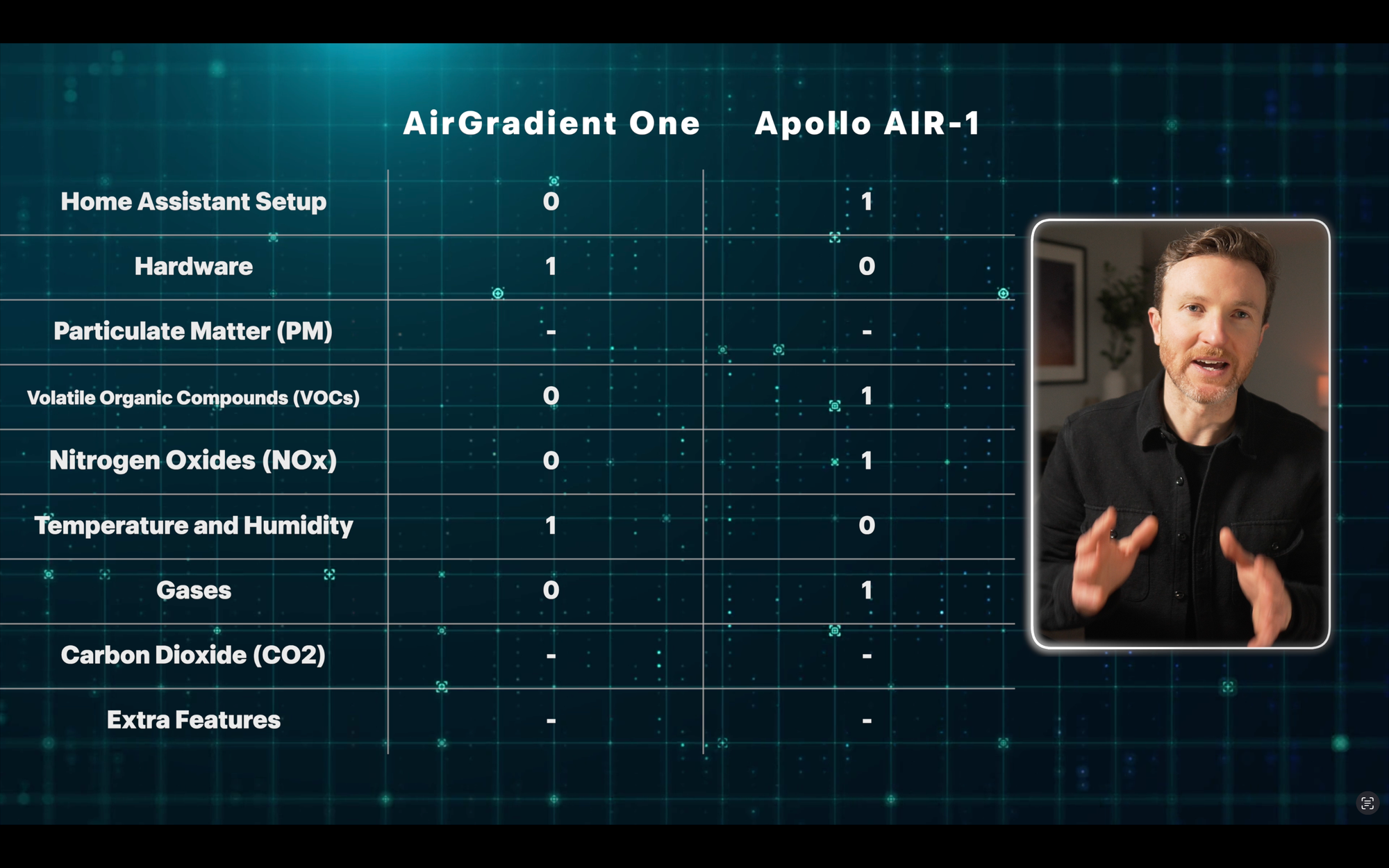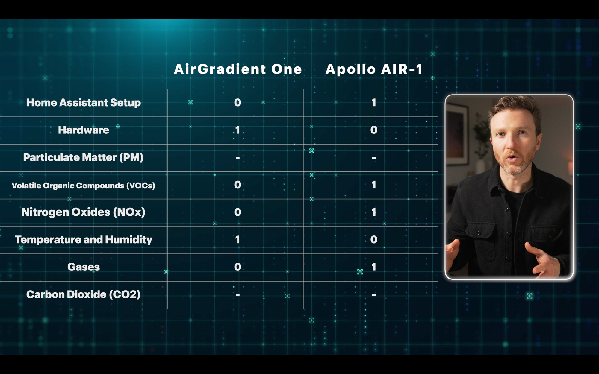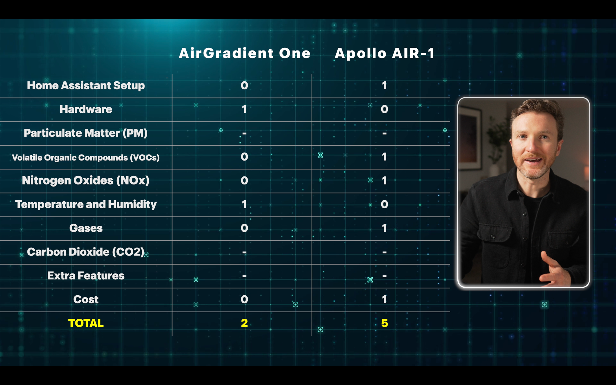 Based on point totals, the Apollo AIR-1 comes out ahead, with five points compared with two points for the AirGradient One. Both devices tied in the remaining three categories.