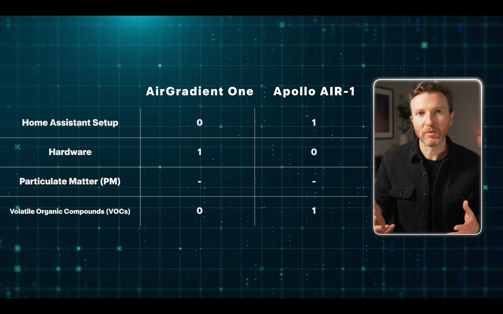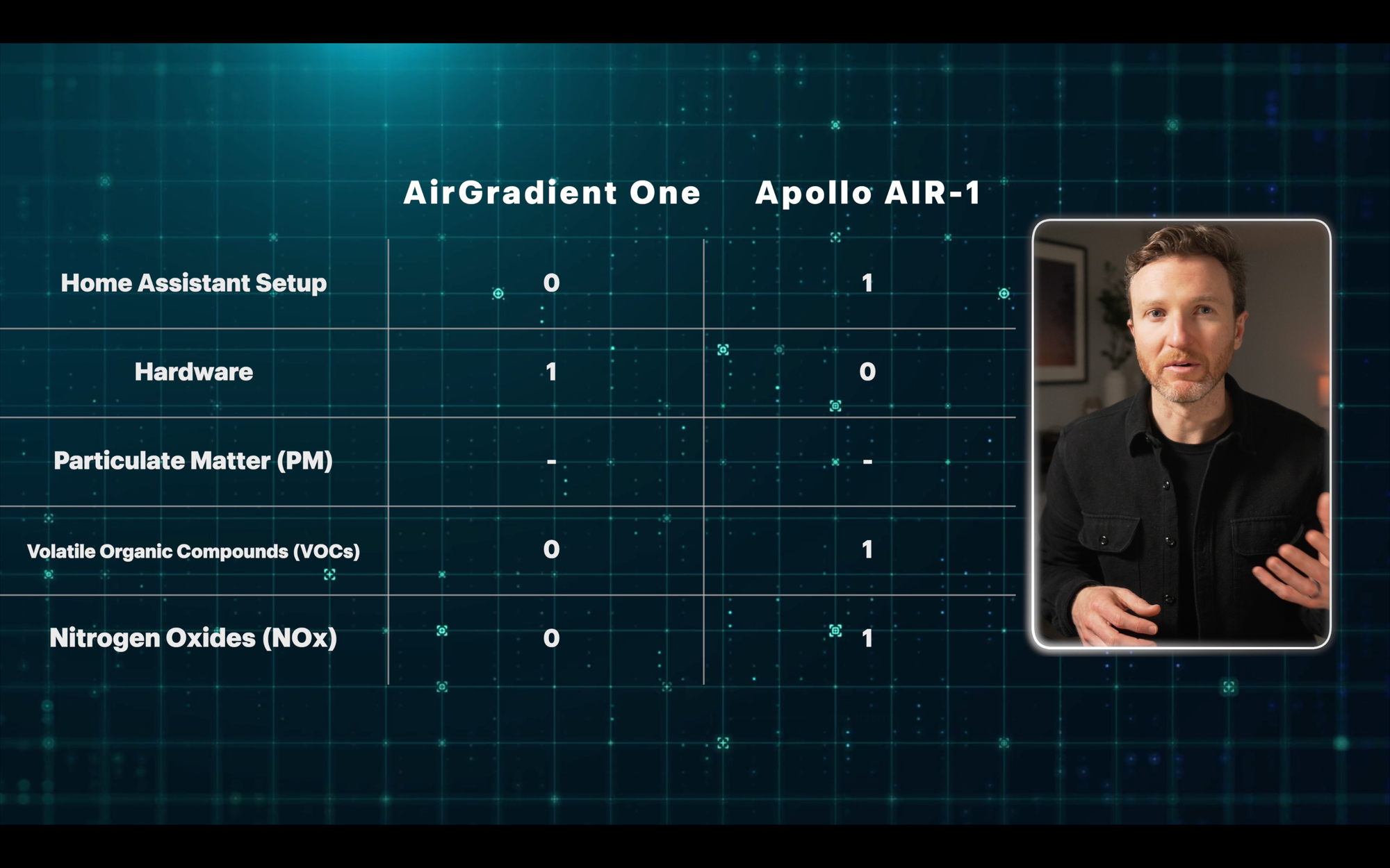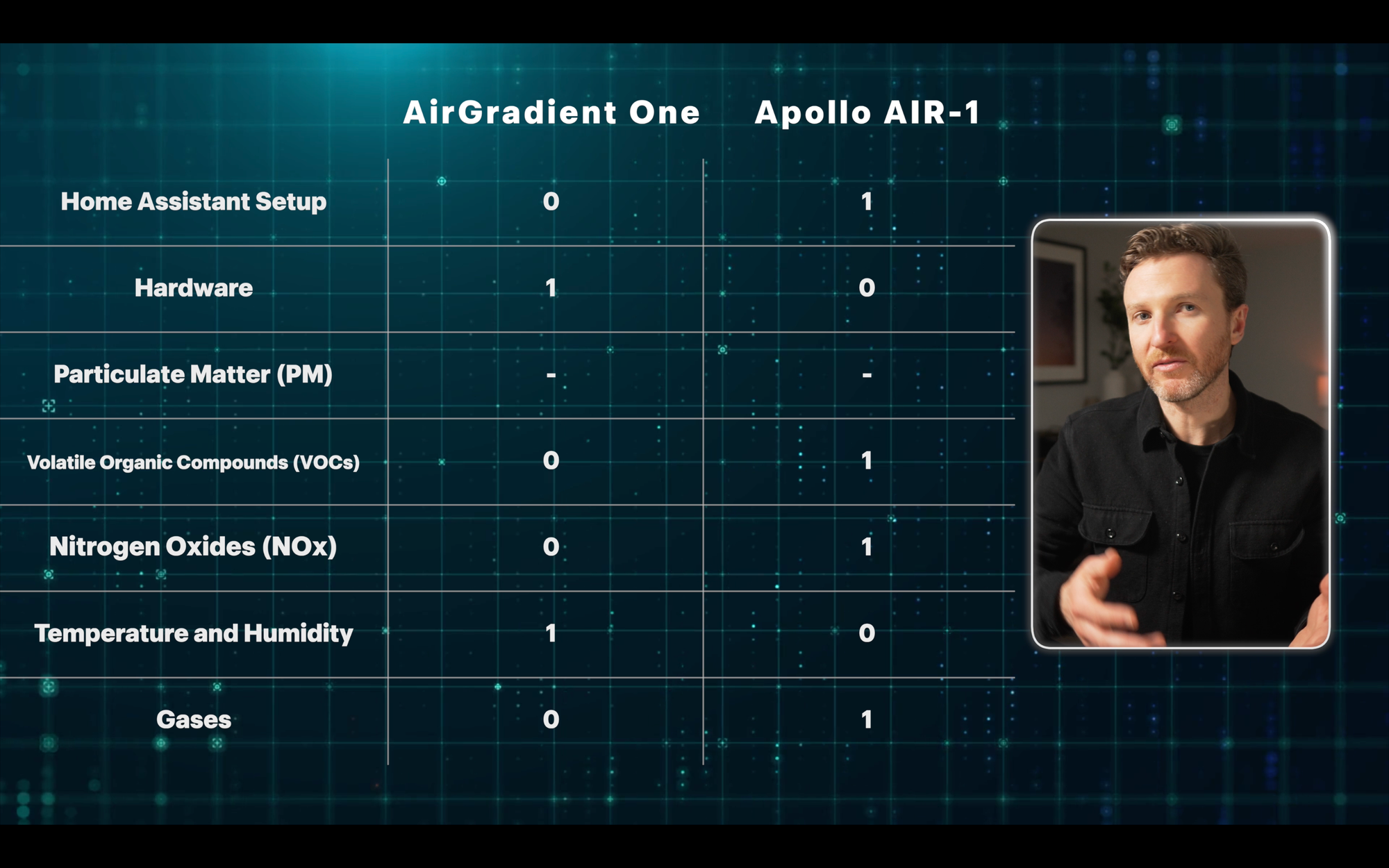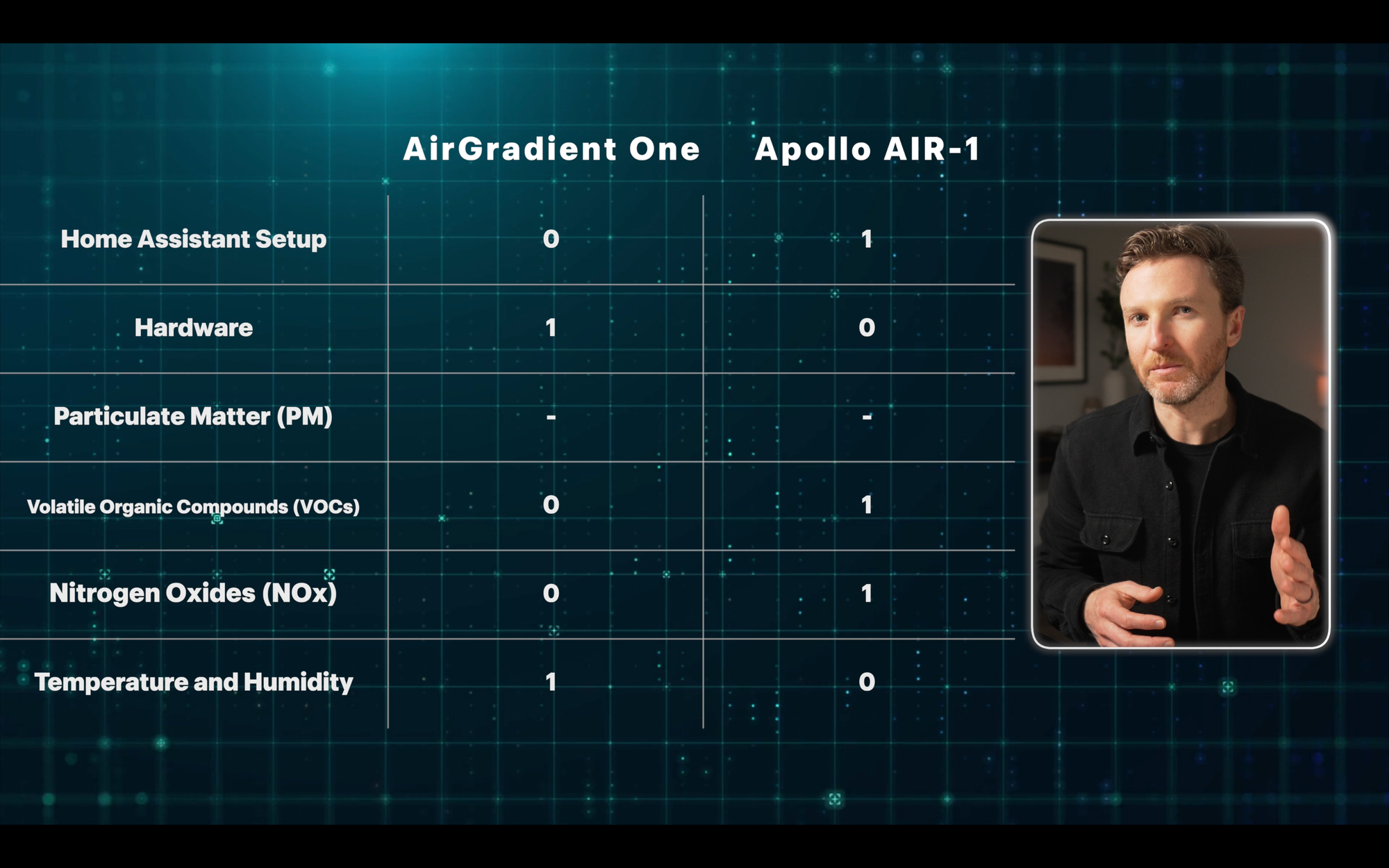 Based on point totals, the Apollo AIR-1 comes out ahead, with five points compared with two points for the AirGradient One. Both devices tied in the remaining three categories.