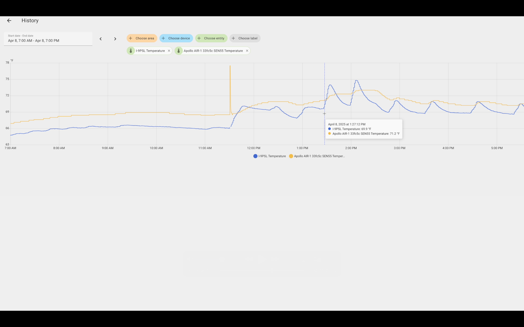 Looking at the temperature data, the story is a bit murky. The AirGradient generally reported a lower temperature, and the data would spike up and down quite a bit. The Apollo was smoother overall, except for one massive, inexplicable upward spike of 9° F instantly, only to come right back down.