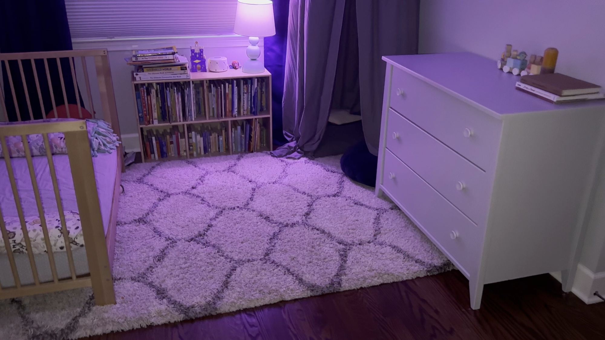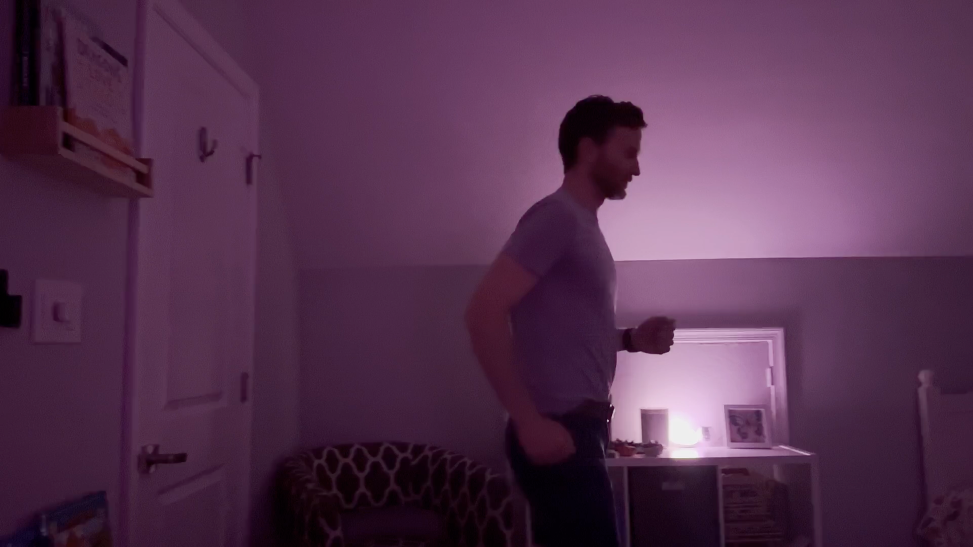 Once that automation tires them out, it’s time to get ready for bed. Another tap on the scene controller, and a sleepy vibe takes over the room. A single Philips Hue light turns a soft purple, all other lights go off, and a sleep sounds playlist shuffles on the Sonos speakers. Even I can’t help but relax.