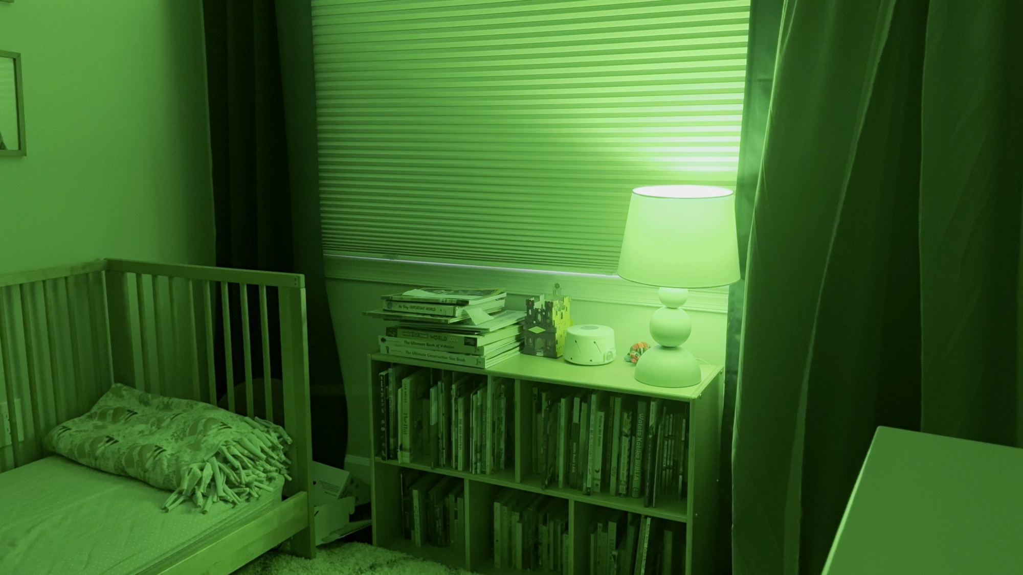 Now that everyone is calmed down, it’s time to fall asleep. With another single tap on the scene controller, all the lights turn off, and a white noise machine and a baby monitor turn on.