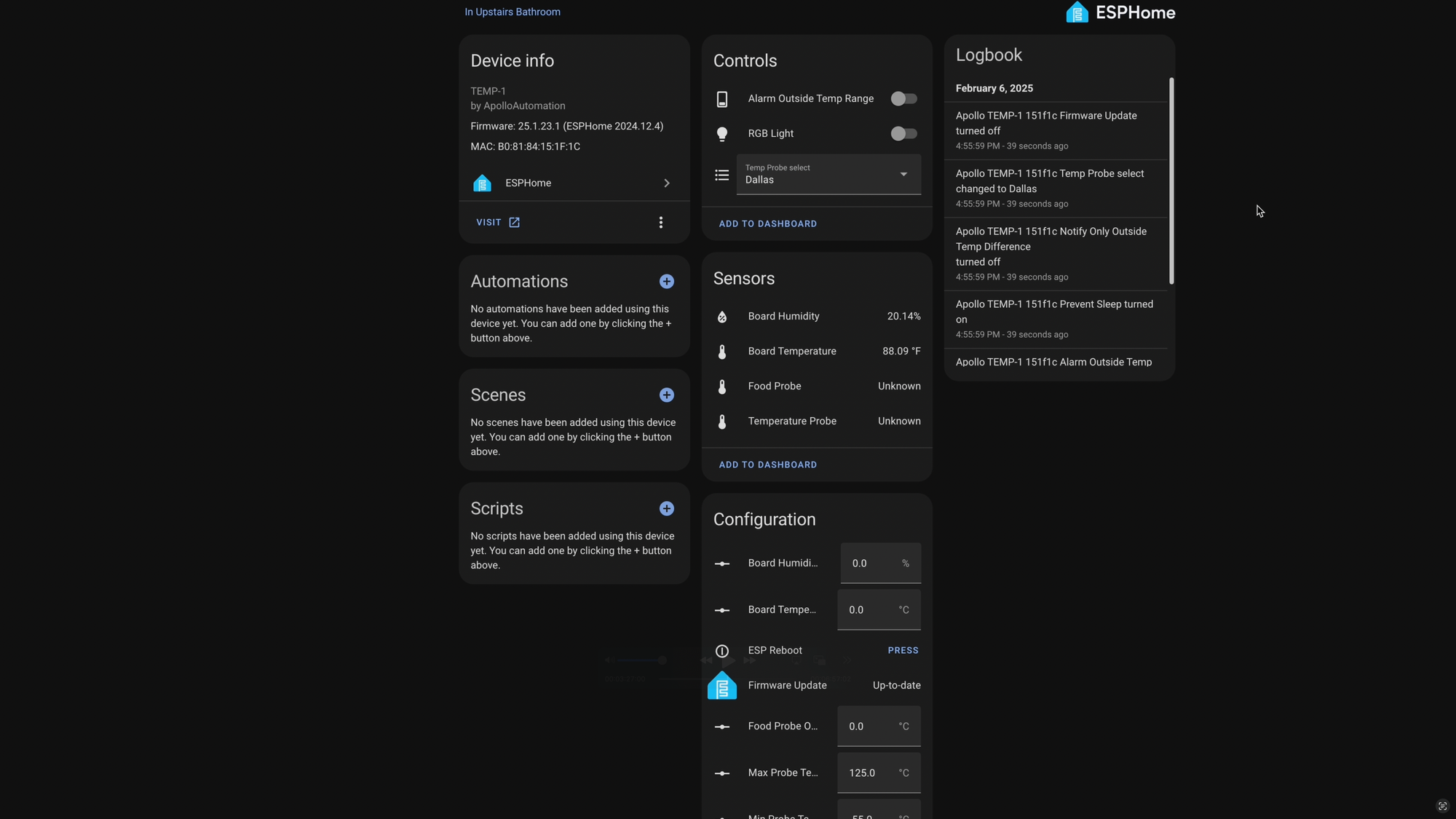 I’m taking a long at a temperature sensor for Home Assistant that offers something different. The TEMP-1 from Apollo Automation can not only track ambient air temperature and humidity, but also the temperature inside a fridge or freezer, or food in ovens or grills, or water in cooking pot, pool, hot tub, or fish tank. And it also has a built-in RGB light and buzzer for alerting you when temperature conditions are outside the expected range.