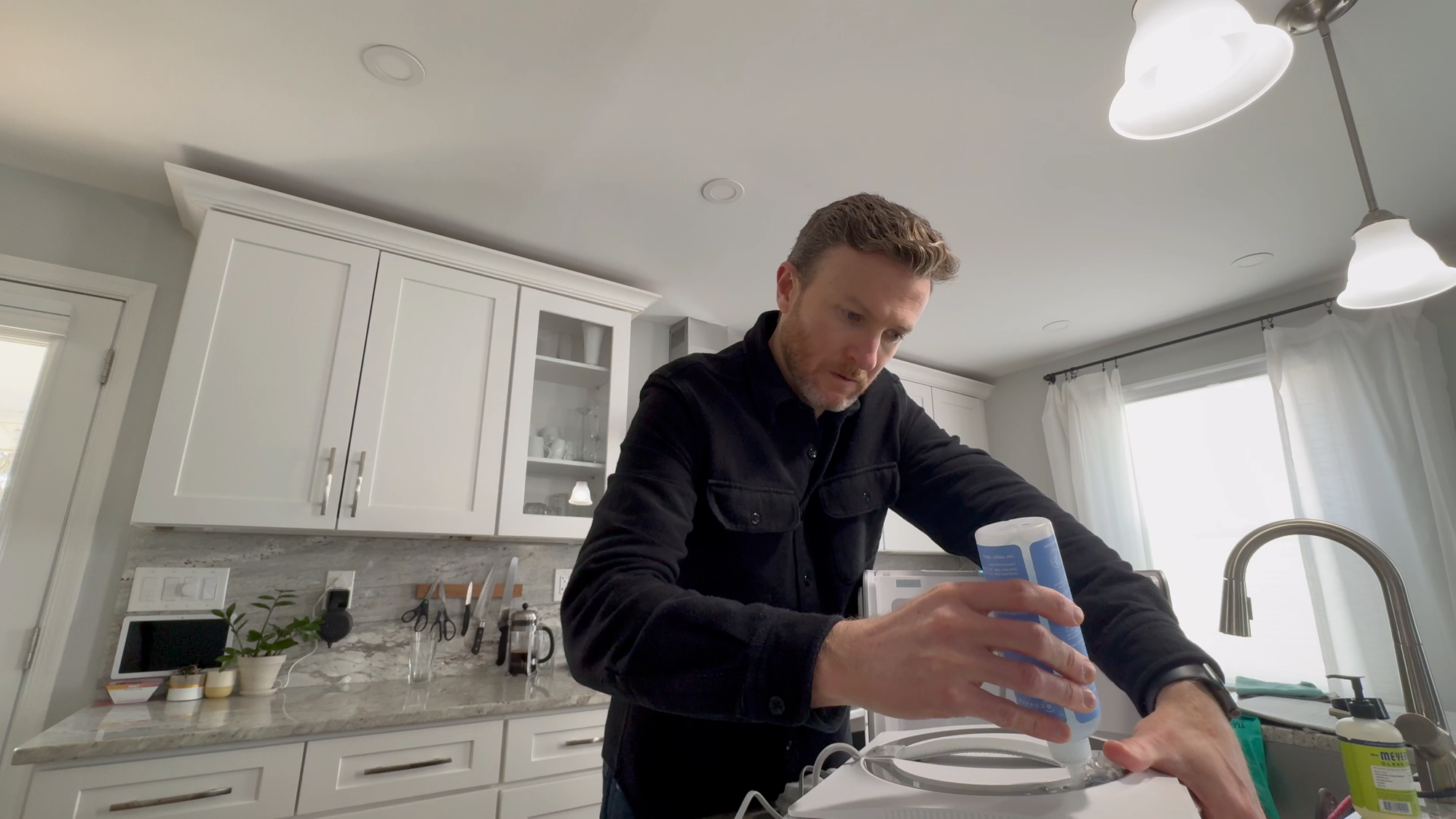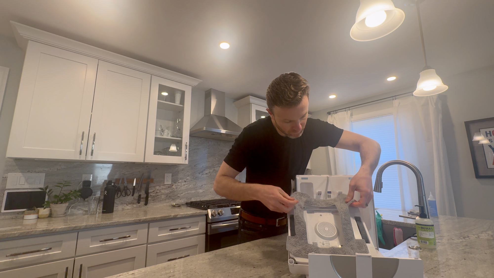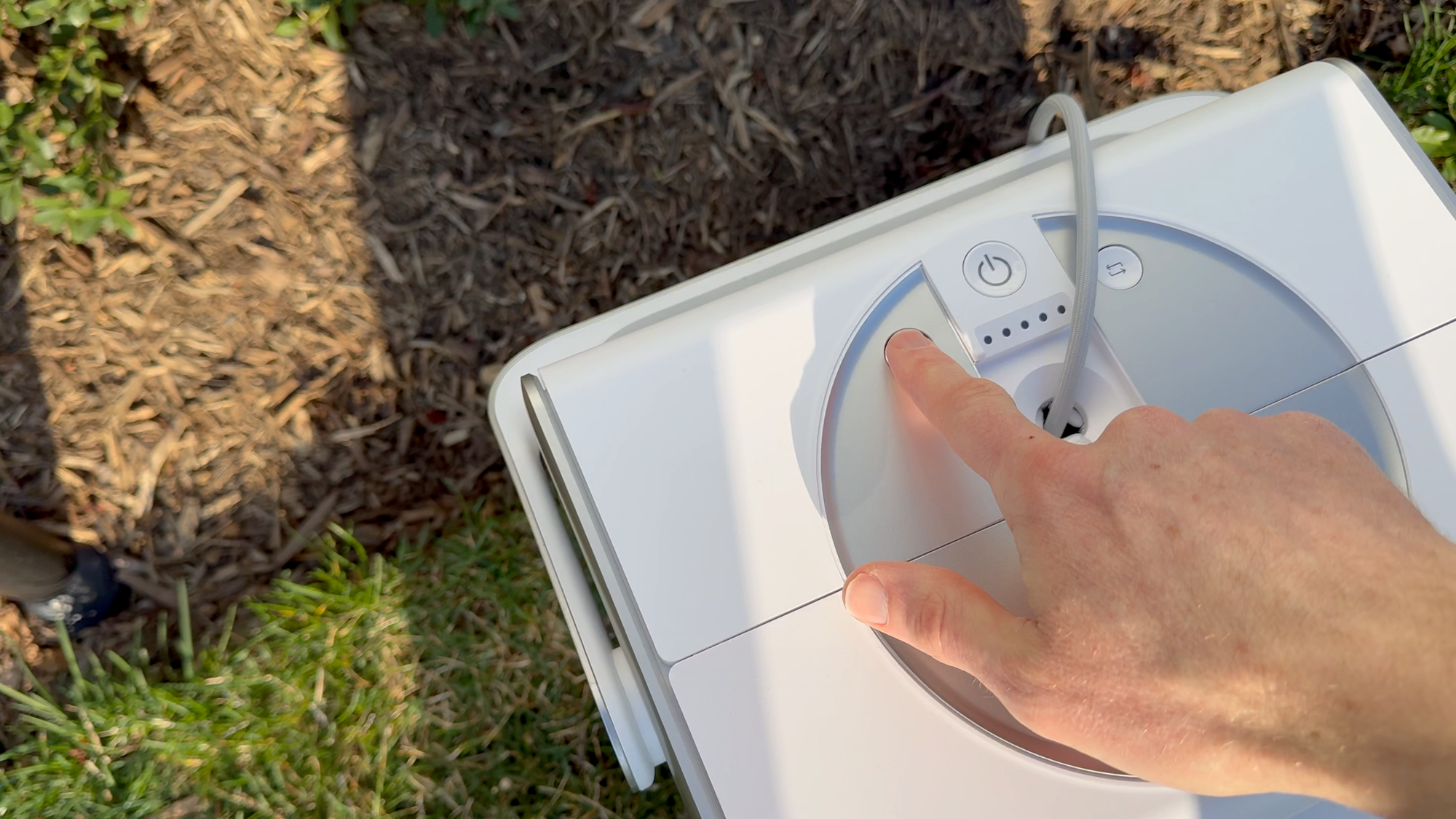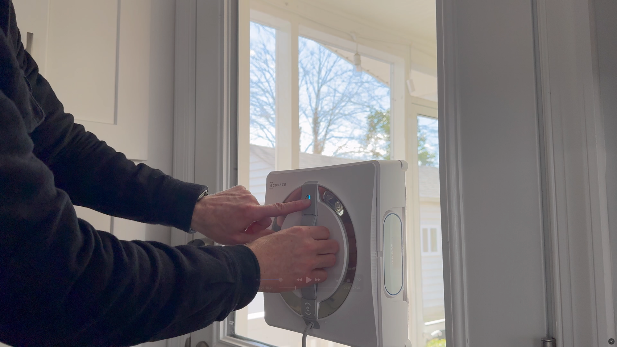 To actually clean, you wet a mop cloth in the sink, and then attach it to the bottom of the robot similar to Velcro. You’ll also add a window cleaning solution or water to a tank in the robot. To start it, you hold the robot against the window, and hold down the power button on the robot for two seconds. This engages the fan, and creates a suction against the glass. A voice then speaks to confirm when it’s safe to let go.