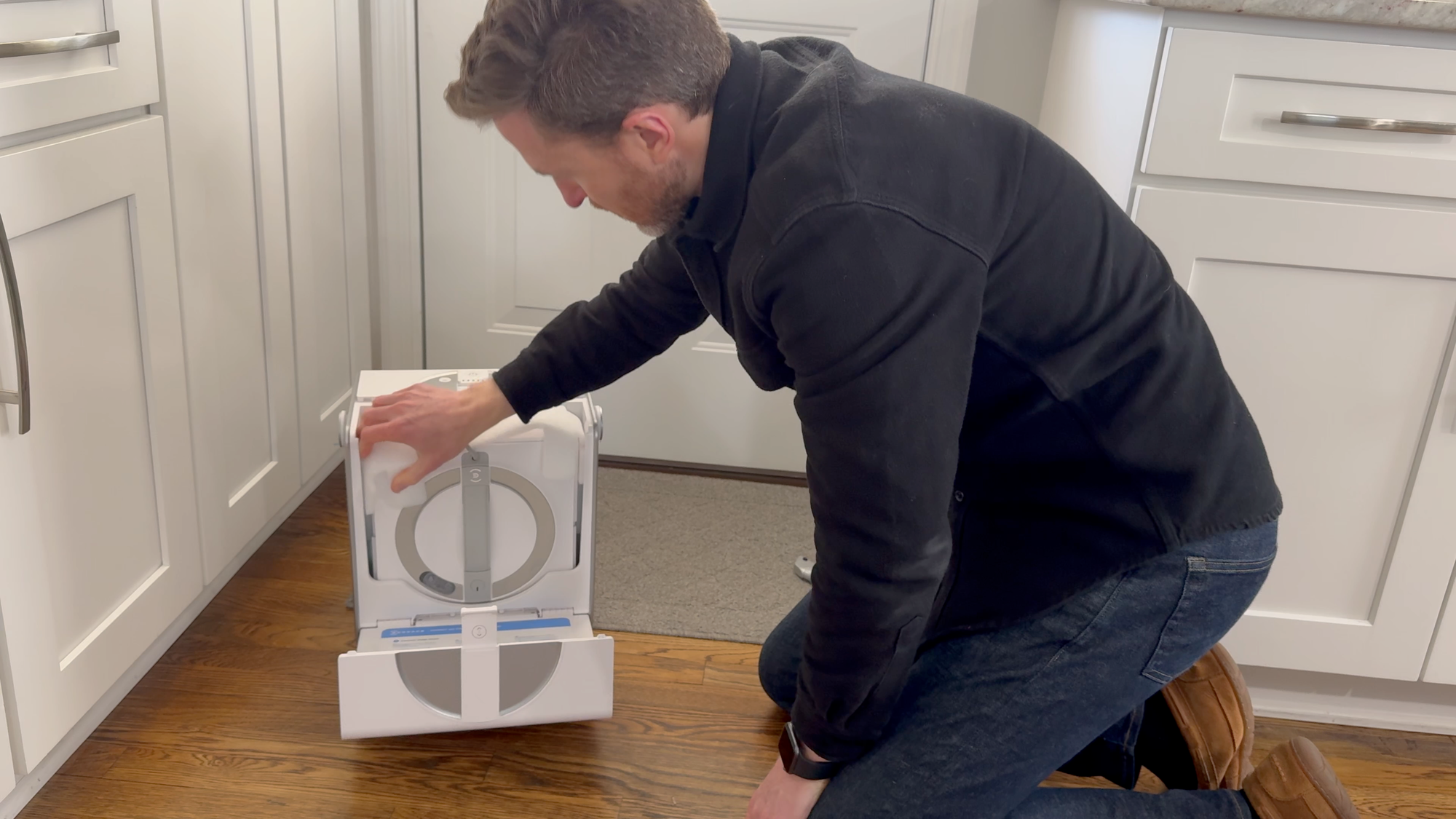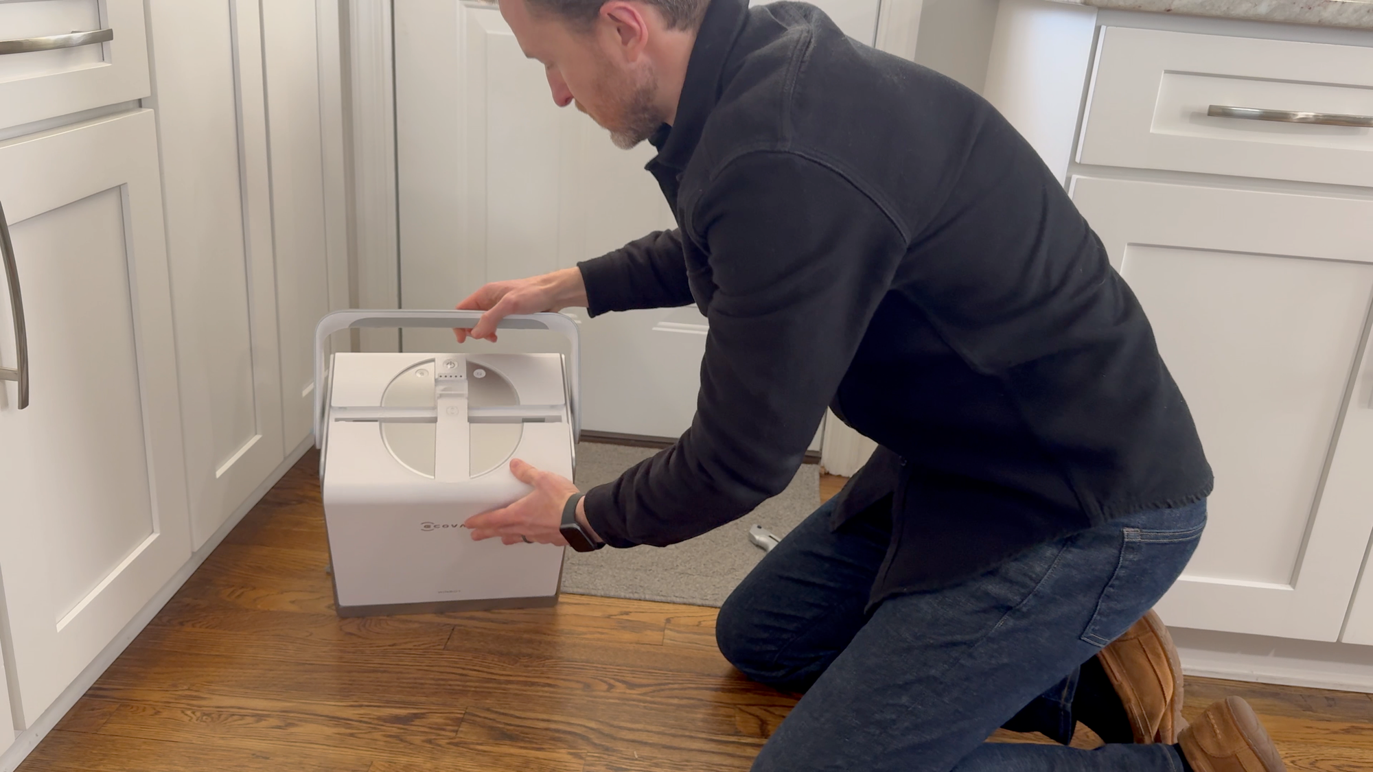 Inside the box, you’ll find a portable case that reminds me of a beverage cooler. This case functions as storage for the robot cleaner and battery power so you’re not reliant on plugging it into an outlet. The bottom of the case has suction cup-like design to anchor it firmly to a surface.