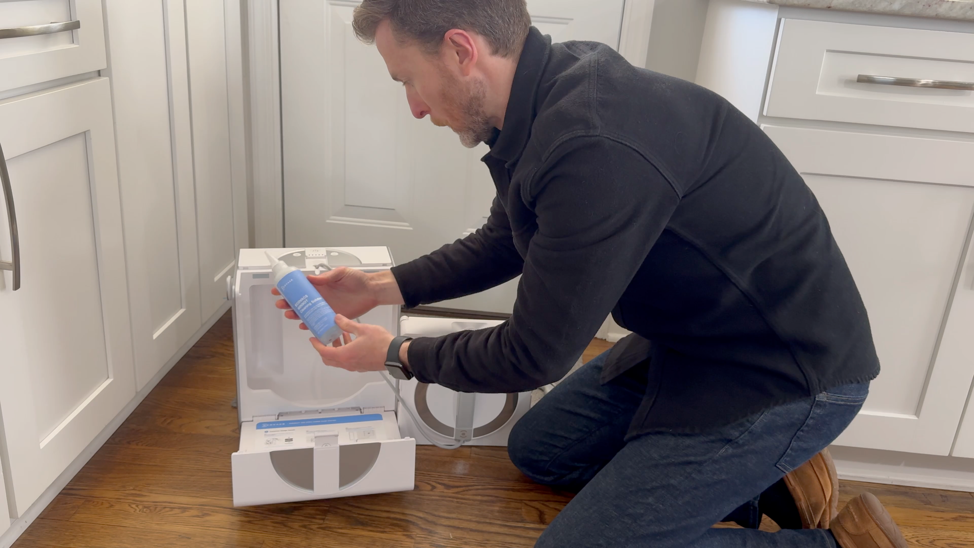 Behind the robot in the case is window cleaning solution. There is a rubber stopper on top of the robot that opens for you to add the cleaning solution, or just water.