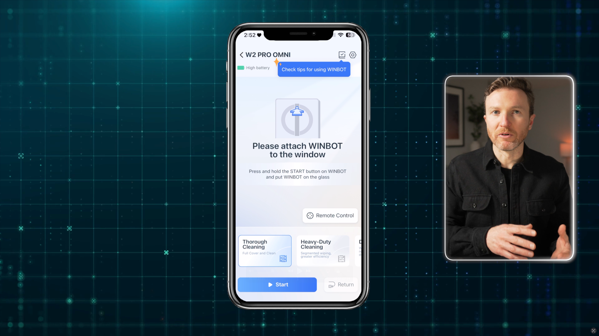 From the ECOVACS app, you have numerous cleaning modes to choose from, including fast cleaning for interior windows, and deep cleaning for exterior windows or especially dirty ones, among others.